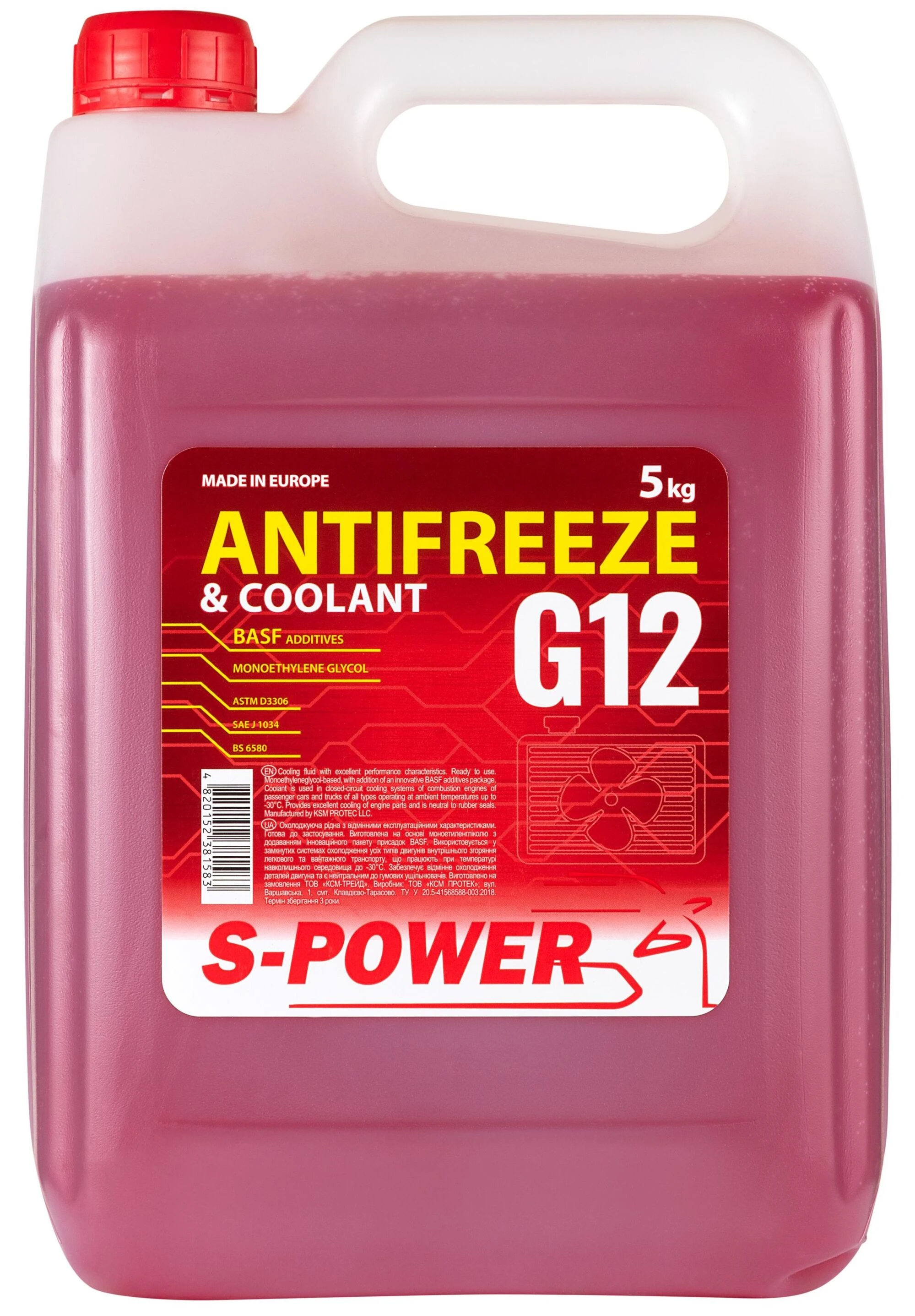 S-POWER ANTIFREEZE (G12) червоний Охолоджувальна рідина S-POWER ANTIFREEZE (G12) червоного кольору призначена для двигунів внутрішнього згоряння з рідинною системою охолодження. Захищає систему від замерзання при температурах до -30°C, перегріву та корозії. Підходить для легкових, вантажних автомобілів, сільськогосподарської техніки та іншого обладнання, що працює в навантажених умовах. S-POWER виготовляє технічні рідини з урахуванням вимог сучасних систем охолодження. Уся продукція проходить перевірку якості та відповідає вимогам експлуатаційної безпеки. Антифризи бренду призначені для надійної роботи в реальних умовах.