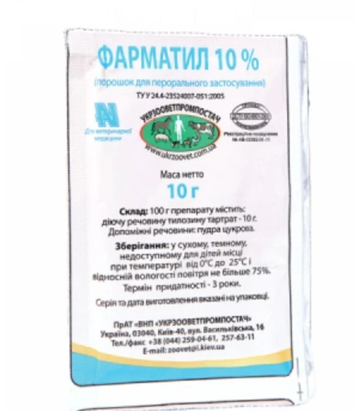 Антимікробний препарат Фарматил-200 розчин - ін’єкційний антибактеріальний препарат на основі тилозину тартрату для боротьби з інфекціями дихальної, травної та репродуктивної систем у тварин.