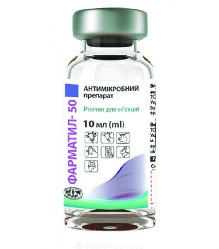 Антимікробний препарат Фарматил-50 розчин - антимікробний препарат у формі ін’єкційного розчину для лікування бактеріальних інфекцій у тварин. Містить тилозину тартрат у концентрації 50 мг/мл. Підходить для використання у великої рогатої худоби, свиней, овець, кіз, котів, собак, кролів та індиків. Упаковка - скляний флакон 10 мл.