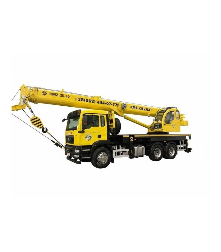 Автокран KMZ 25–40 - стріловий самохідний кран на автомобільному шасі для будівельних, навантажувально-розвантажувальних та кар’єрних робіт. Підіймає вантажі до 25 000 кг і працює з вантажним моментом до 80 т·м. Стріла має довжину 10,4–32,26 м, а максимальна висота підйому становить 30 м. Машина розрахована на роботу в умовах обмеженого доступу до об’єкта та на майданчиках, де важлива точність і безпечне керування підйомом.