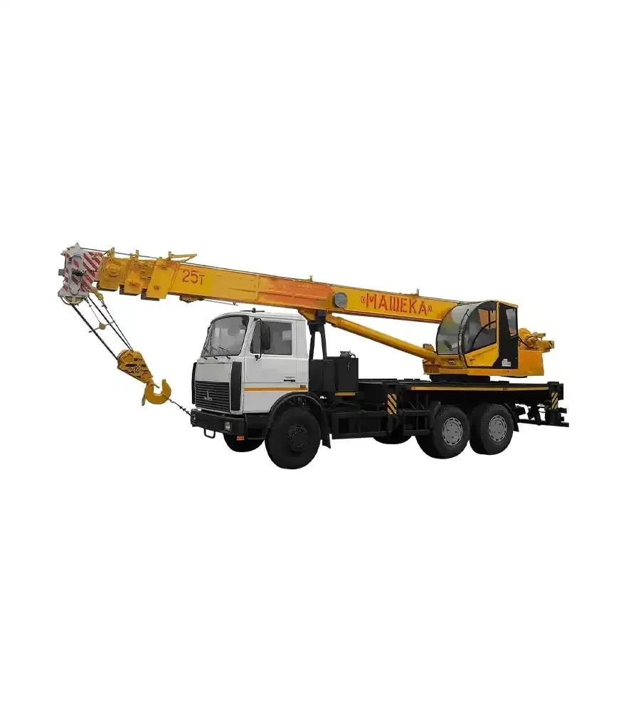 Автокран МАЗ КС-55727-1 оснащений шасі МАШЕКА, що забезпечує відмінну маневровість і простоту управління, дозволяючи ефективно використовувати його на різних під'їзних шляхах. Компактні розміри роблять цей автокран ідеальним для роботи в обмежених умовах міського середовища. Привід установки здійснюється за допомогою аксіально-поршневого насоса, який працює через трансмісію та додаткову коробку відбору потужності. Лебідки для підйому і повороту мають планетарну конструкцію, а нижня рама виконана з коробчатим перетином, з нахиленими гідравлічними виносними опорами. Кранові механізми обладнані індивідуальним приводом з незалежним управлінням через гідромотори і гідроциліндри, що забезпечує плавність роботи та можливість одночасного виконання кількох завдань. Чотирисекційна стріла завдовжки від 10,08 до 28,08 м забезпечує компактність під час переміщень і широку робочу зону в розкладеному стані, з вильотом 20 метрів і висотою підйому до 27 метрів. Телескопічна система стріли дозволяє виконувати монтажні роботи у важкодоступних місцях