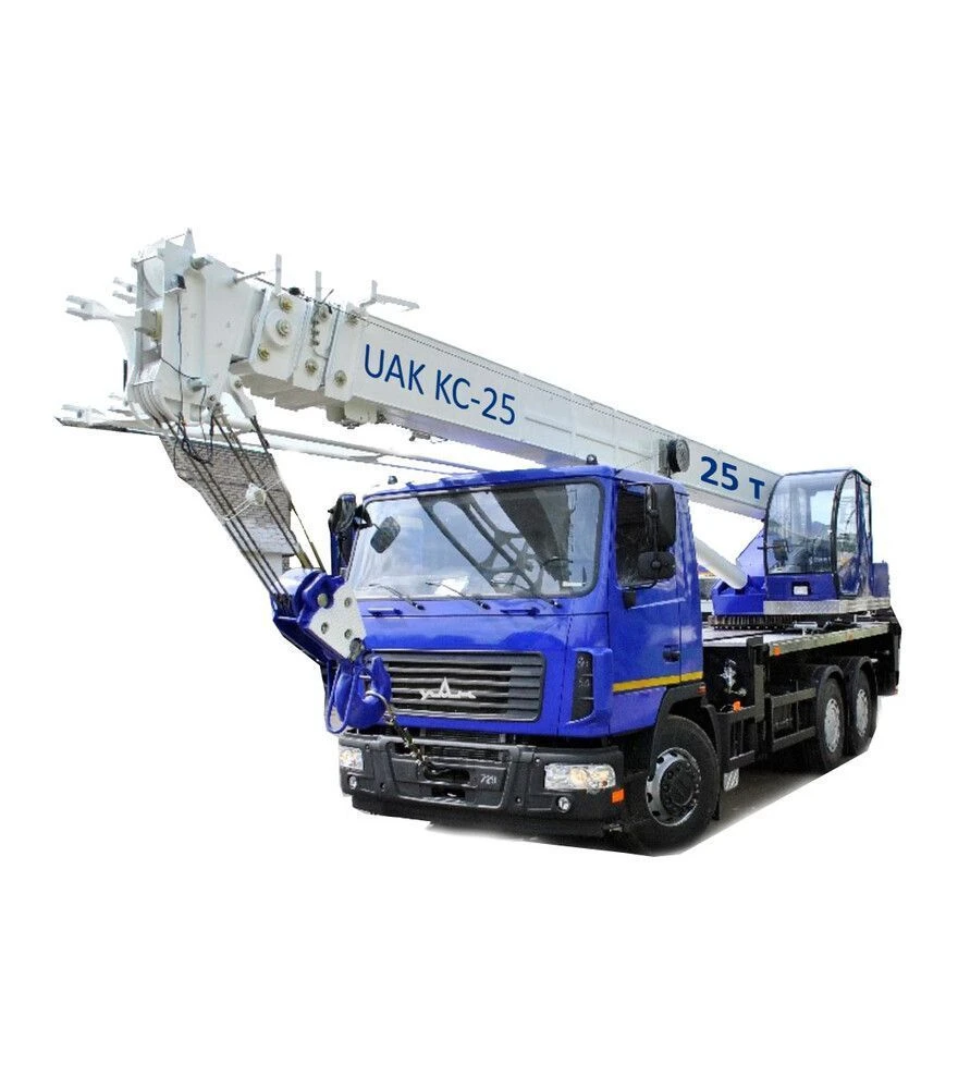 Автокран ZUBR КС-55727-С-12 на шасі МАЗ-6312С3-529-010 Євро-5 з колісною формулою 6×4 призначений для підйомно-монтажних робіт із вантажами до 25 т. Телескопічна чотирьохсекційна стріла довжиною 10,08–28,08 м забезпечує висоту підйому до 27,1 м та роботу з максимальним вильотом 20 м. Машина розрахована на щоденну експлуатацію в будівництві, на виробництві та під час сервісних робіт.