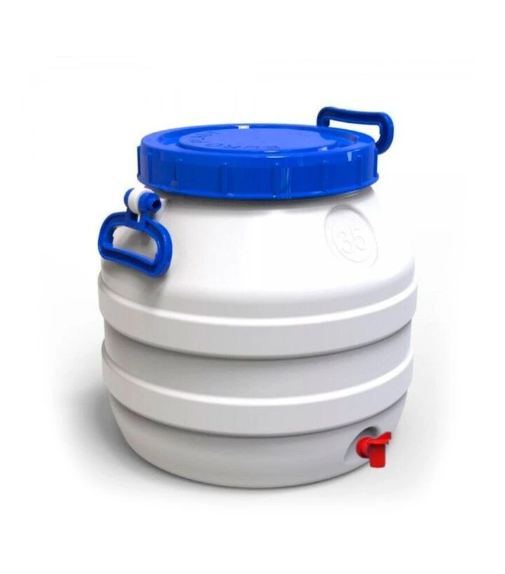 Бідон пластиковий харчовий 35 л з пластиковим краном, Євро ПластХарчовий пластиковий бідон Євро Пласт об’ємом 35 літрів призначений для зберігання та зручного зливу рідких харчових продуктів. Ємність виготовлена з якісного харчового пластику без запаху, який не впливає на смак і властивості вмісту. Бідон укомплектований стандартним пластиковим краном, що значно спрощує дозований злив води, молока, соків, меду або інших рідин у побутових та господарських умовах.