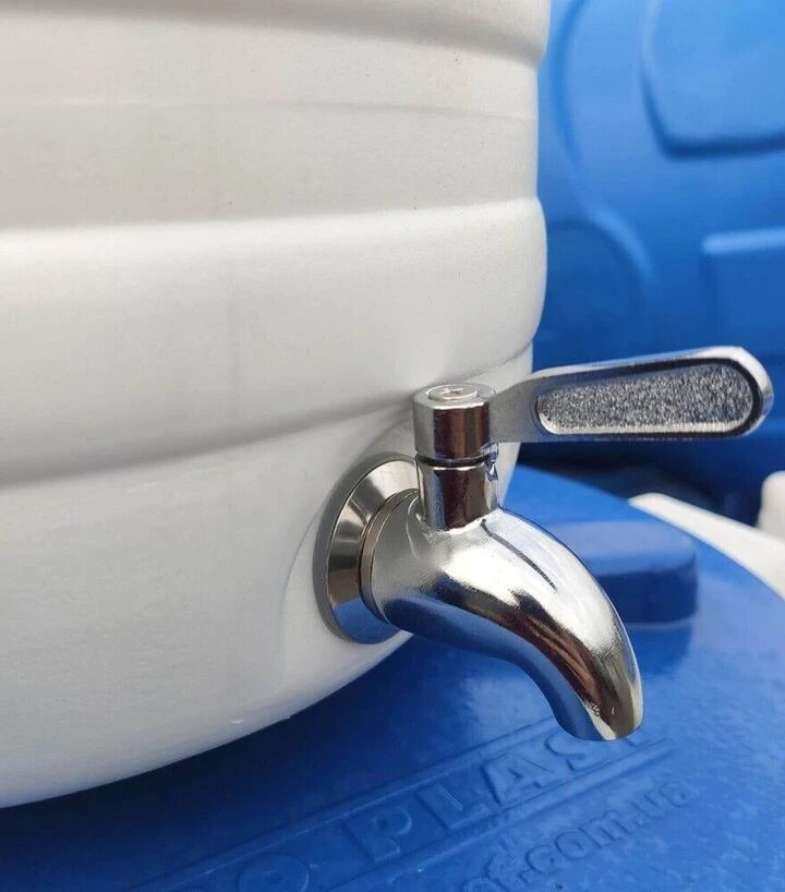 Ємність укомплектована нержавіючим зливним краном AISI 304, який відзначається високою корозійною стійкістю, довговічністю та гігієнічністю. Такий кран ідеально підходить для роботи з питною водою, молоком, медом, соками, розсолами та іншими харчовими рідинами. Отвір під кран виконаний заводським способом, що забезпечує точну посадку та герметичність. Уся фурнітура - кран, муфта, штуцер і ущільнювачі - знаходиться всередині бідона.
