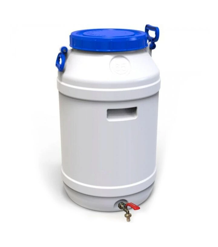 Бідон Євро Пласт харчовий 65 л з латунним краномХарчовий бідон Євро Пласт об’ємом 65 л призначений для зберігання, транспортування та зручного використання рідких і сипучих продуктів у фермерських господарствах, приватних домогосподарствах і підсобних приміщеннях. Ємність виготовлена з якісного харчового пластику, який не має стороннього запаху та не впливає на смак і властивості продуктів. Бідон має циліндричну форму, широку горловину та дві міцні ручки, що полегшує наповнення, перенесення й очищення. У нижній частині передбачено зливний латунний кран для контрольованого відбору вмісту.