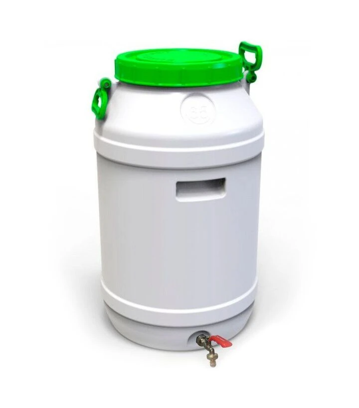 Бідон Євро Пласт харчовий 65 л з латунним краном та зеленою кришкоюХарчовий бідон Євро Пласт об’ємом 65 л призначений для зберігання та використання рідких і сипучих продуктів у фермерських господарствах, приватних домогосподарствах і підсобних приміщеннях. Ємність виготовлена з якісного харчового пластику, який не має стороннього запаху та не впливає на властивості вмісту. Циліндрична форма, широка горловина та міцні ручки забезпечують зручність наповнення, перенесення й очищення. Бідон укомплектований латунним зливним краном, а зелена кришка дозволяє легко ідентифікувати тару серед іншої ємності.
