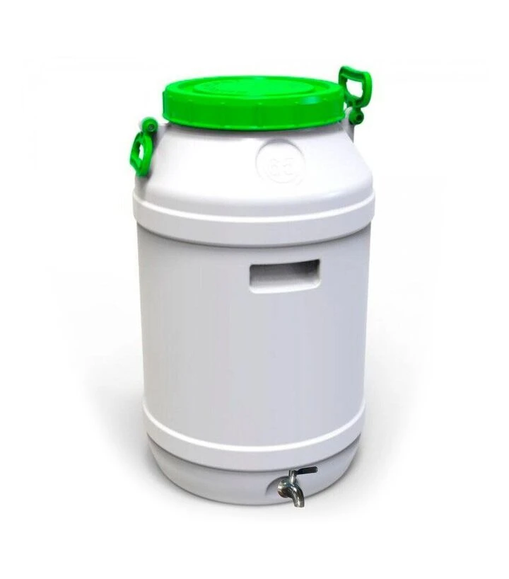 Бідон Євро Пласт харчовий 65 л з нержавіючим краном AISI 304 та зеленою кришкоюХарчовий бідон Євро Пласт призначений для зберігання, транспортування та щоденного використання рідких і сипучих продуктів у фермерських господарствах, на пасіках, у приватних домогосподарствах та малих виробництвах. Ємність виготовлена з якісного харчового пластику, який не має стороннього запаху та не впливає на властивості вмісту. Конструкція передбачає зручну циліндричну форму, широку горловину та дві міцні ручки для перенесення. Бідон комплектується зливним краном з нержавіючої сталі AISI 304, що підходить для контакту з харчовими продуктами. Зелена кришка дозволяє легко ідентифікувати тару серед іншої місткості.