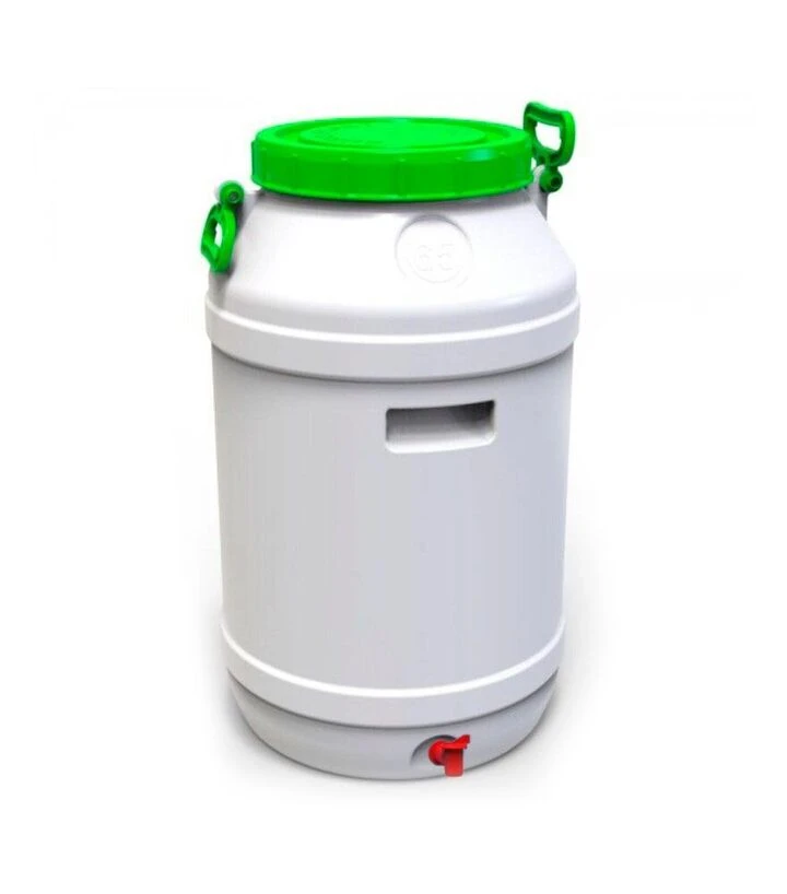 Бідон Євро Пласт харчовий 65 л з пластиковим краном та зеленою кришкоюХарчовий бідон Євро Пласт призначений для зберігання та використання рідких і сипучих продуктів у фермерських господарствах, приватних домогосподарствах і підсобних приміщеннях. Ємність виготовлена з якісного харчового пластику, який не має стороннього запаху та не впливає на смак чи властивості продуктів. Бідон має зручну циліндричну форму, широку горловину та міцні ручки для перенесення. Зелена кришка допомагає швидко ідентифікувати тару серед іншої місткості. У комплект входить пластиковий зливний кран для контрольованого використання вмісту.