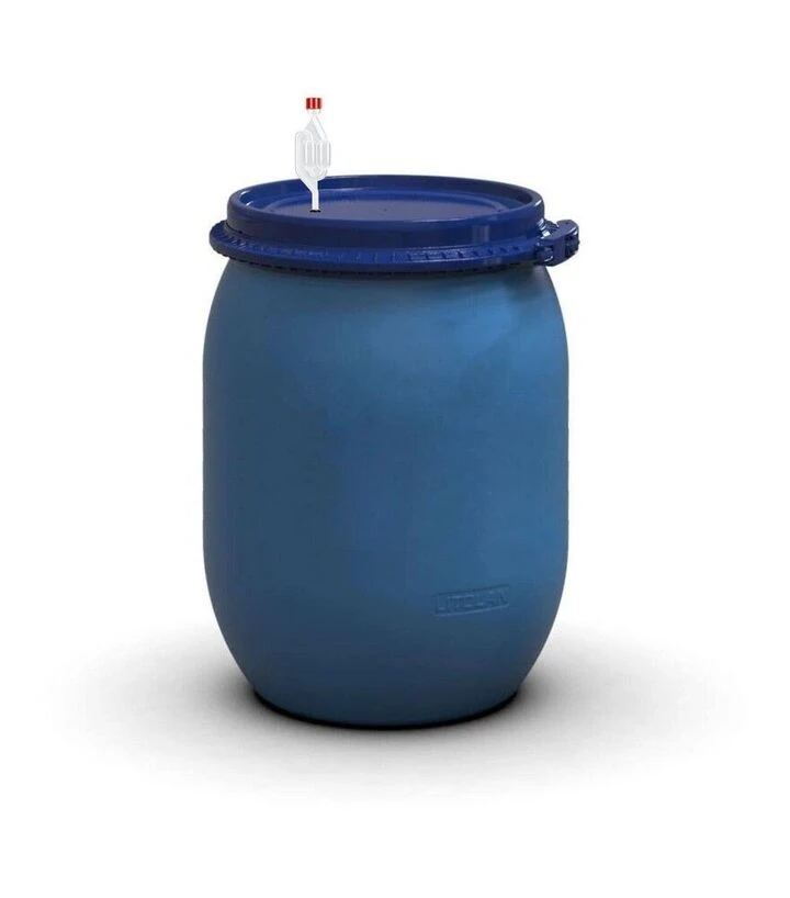 Під час бродіння всередині бочки утворюється вуглекислий газ, який відводиться через S-подібний винний клапан. Такий гідрозатвор працює за принципом двокамерної системи: він виводить гази назовні та водночас не допускає потрапляння повітря всередину ємності. Кришка встановлюється з ущільнювачем і фіксується хомутом, що забезпечує герметичність протягом усього процесу ферментації. За потреби бочку можна доукомплектувати зливним краном діаметром 1/2".