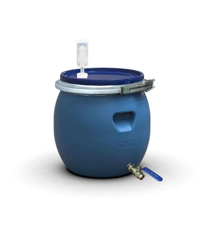 Бочка для бродіння 35 л з гідрозатвором U, металевим хомутом та краном з нержавіючої сталі AISI 304Харчова бочка для бродіння об’ємом 35 літрів призначена для контрольованої ферментації вина, пива, медових напоїв, квасу, а також для тимчасового зберігання та засолювання харчових продуктів. Ємність виготовлена українським виробником Litolan з сертифікованого харчового пластику та відповідає вимогам безпеки для контакту з напоями й продуктами.