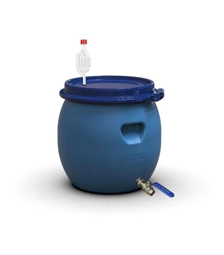 Бочка наповнюється через широку горловину, після чого кришка щільно притискається та фіксується хомутом з ущільнювачем. У кришці встановлюється S-подібний двокамерний винний клапан, який відводить вуглекислий газ і водночас запобігає доступу кисню всередину ємності. Вбудований зливний кран 1/2" з нержавіючої сталі AISI 304 дозволяє акуратно зливати готовий продукт без нахилу бочки, зберігаючи чистоту та контроль подачі.