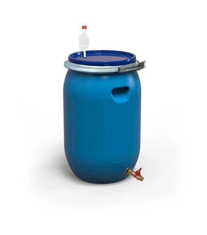 У процесі бродіння в ємності утворюється вуглекислий газ, який відводиться через S-подібний гідрозатвор. Він запобігає потраплянню кисню ззовні та допомагає підтримувати стабільний тиск усередині бочки. Кришка з ущільнювачем фіксується металевим хомутом, забезпечуючи герметичність. Латунний зливний кран 1/2" дозволяє зливати готовий продукт без відкривання ємності.