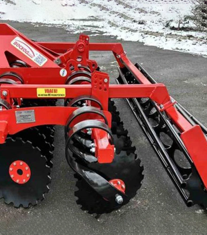 Борона дискова СХІД БН-2,6П-01 з пружинними стійкамиДискова борона СХІД БН-2,6П-01 з пружинними стійками призначена для стерньової та передпосівної обробки легких і середніх ґрунтів після оранки або для створення мульчі. Агрегат виконує кілька операцій за один прохід: підрізання і заробку пожнивних решток, перемішування ґрунту з рослинними залишками, розрихлення, вирівнювання та ущільнення ґрунту. Підходить для роботи з тракторами потужністю 70–90 к.с., має робочу ширину 2,6 м, оснащується 20 дисками діаметром 500 мм і працює на глибину 4–12 см. Оптимальна швидкість роботи - 8–15 км/год, що дозволяє обробляти до 2,6 га/год.