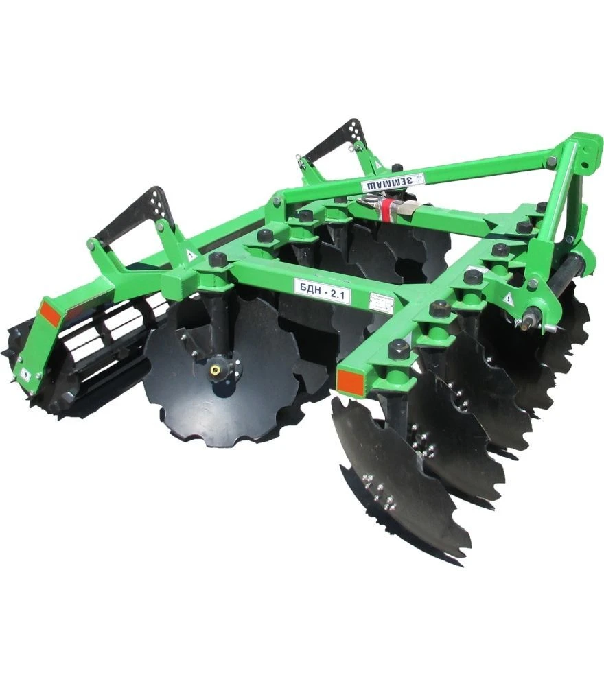 Борона дискова ЗЕММАШ БДН-2.1 навісна ЗЕММАШ БДН-2.1 - навісна дискова борона з шириною захвату 2,1 м, призначена для передпосівного та поверхневого обробітку ґрунту, лущення стерні та подрібнення рослинних решток. Агрегат має 12 дискових секцій, працює з тракторами потужністю 80–100 к.с. і забезпечує продуктивність 1,5–2 га/год. Власна вага - 840 кг. Габарити: довжина 2300 мм, ширина 2500 мм, висота 1300 мм. Навісний тип агрегування спрощує приєднання до трактора. ЗЕММАШ - виробник техніки для обробітку ґрунту, орієнтований на потреби господарств з різними площами обробки.