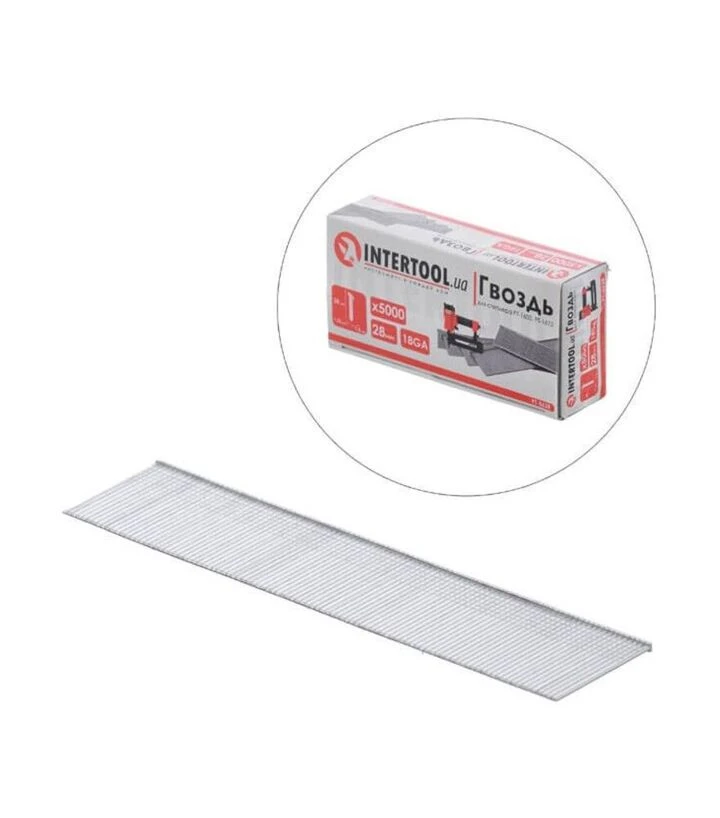 Цвях для степлера INTERTOOL PT-1603, PT-1612, 28 мм, 18GA, 5000 шт (PT-8628) - витратний матеріал для швидкого кріплення у пневмоінструментах PT-1603 та PT-1612. Довжина 28 мм і перетин дроту 1×1,25 мм забезпечують робочу фіксацію, а упаковка 5000 штук підходить для регулярних і серійних задач.
