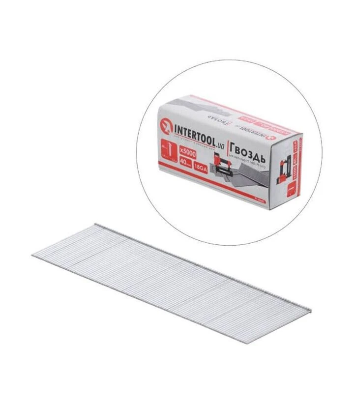 Цвях для степлера INTERTOOL PT-1603, PT-1612, 40 мм, 18GA, 5000 шт (PT-8640) - витратний матеріал для швидкого кріплення у пневмоінструментах PT-1603 та PT-1612. Довжина 40 мм і перетин дроту 1×1,25 мм забезпечують робочу фіксацію, а упаковка 5000 штук підходить для регулярних і серійних задач.