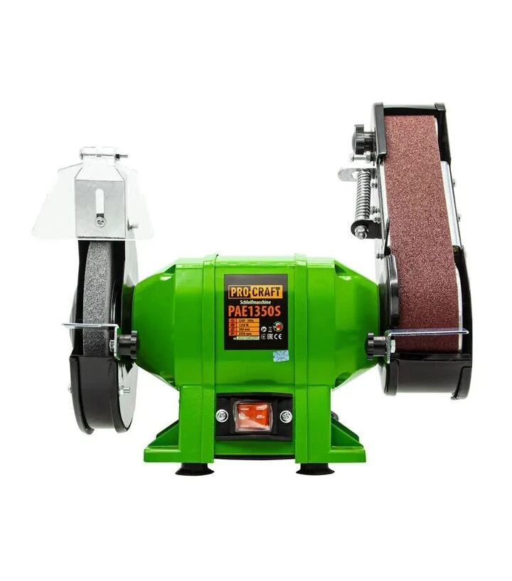 ProCraft PAE-200/1350S - дисково-стрічковий шліфувальний верстат 350 Вт зі швидкістю 2950 об/хв, диском 200 мм (32 мм посадка, 16 мм товщина) та шліфуванням стрічкою шириною 50 мм. Працює від 220 В, має клас захисту I та рівень IP20, комплектується диском, стрічкою та захисними елементами.