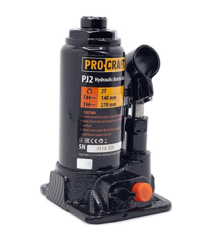 Домкрат гідравлічний Procraft PJ 2Гідравлічний домкрат Procraft PJ 2 підходить для підйому легкових автомобілів та виконання дрібних ремонтних робіт у домашньому гаражі. Вантажопідйомність 2 т дозволяє безпечно підіймати авто під час заміни коліс або огляду днища. Компактна пляшкова конструкція та невелика вага роблять домкрат зручним у транспортуванні та зберіганні. Гідравлічна система забезпечує плавний хід, а ручний насос дозволяє точно контролювати підйом без ривків.