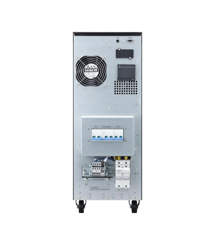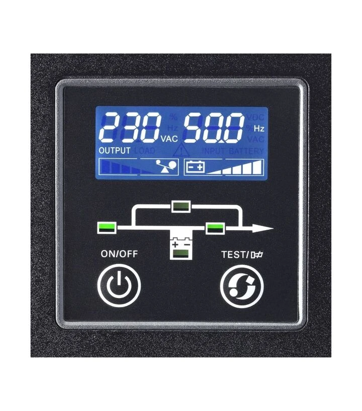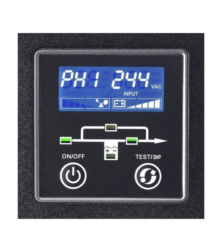 Це джерело безперебійного живлення призначене для стабільної роботи обладнання у системах, де можливі перепади напруги або повні відключення електропостачання. Модель забезпечує живлення серверів, промислових контролерів, мережевих систем та іншої техніки, що потребує безперервної роботи. Конструкція з можливістю підключення зовнішніх батарей дозволяє збільшувати автономність, а зручний дисплей допомагає контролювати ключові параметри. UPS оснащений клемним підключенням, USB та RS232, що спрощує інтеграцію у технічні системи.