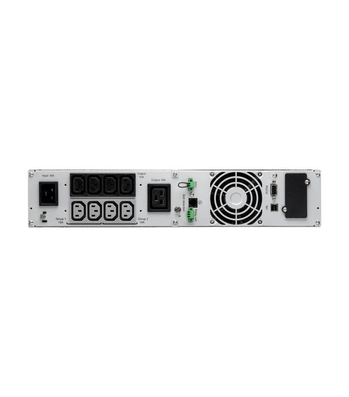 UPS має масу 26,5 кг, глибину 608 мм та ширину 438 мм, що дозволяє комфортно встановлювати його у стійкових системах. Працює на свинцево-кислотних батареях і підтримує підключення зовнішніх модулів для збільшення резервного часу. Завдяки невисокому рівню шуму модель підходить для технічних приміщень. Наявність розеток C13 і C19 забезпечує сумісність з широким спектром обладнання.