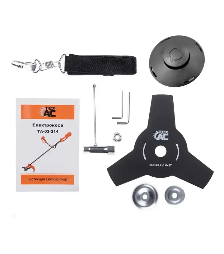 Комплектація: роздільні рукоятки; захисний кожух; плечовий ремінь з карабіном; напівавтоматична шпуля; трьохпелюстковий ніж; нерухомий ріжучий ніж; комплект кріпильних гвинтів і гайок; набір інструментів; інструкція; гарантійний талон