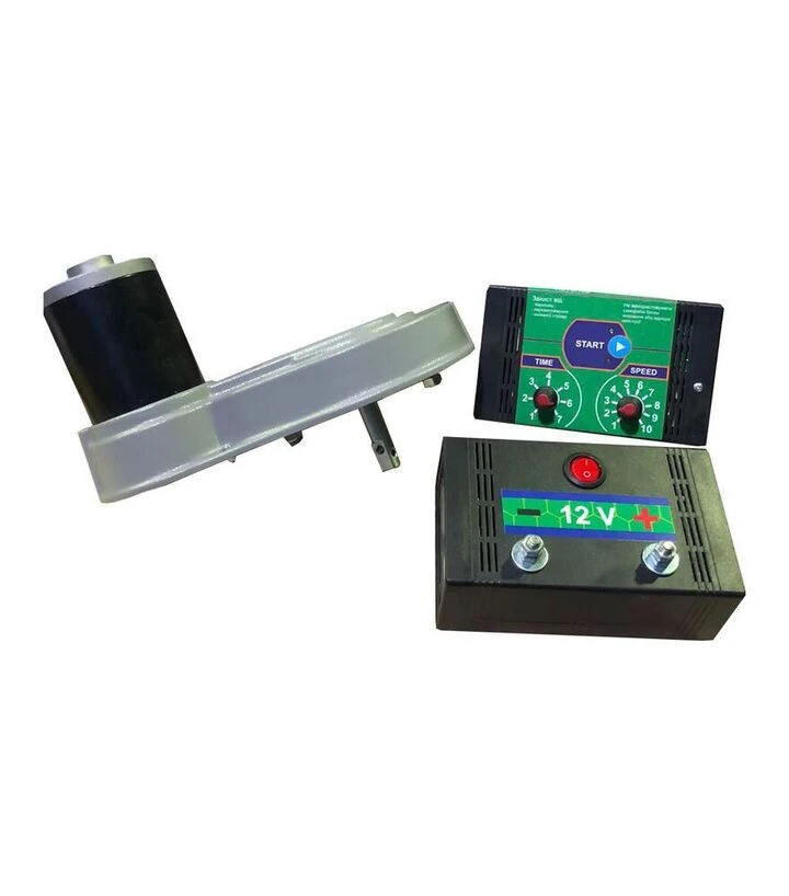 Електродвигун потужністю 100 Вт передає обертання на редуктор медогонки, формуючи необхідний крутний момент для рівномірної роботи ротора. Імпульсний блок живлення перетворює мережеву напругу на стабільні 12 В із струмом 8 А. Швидкість обертання регулюється блоком управління, що дозволяє підібрати оптимальний режим роботи.