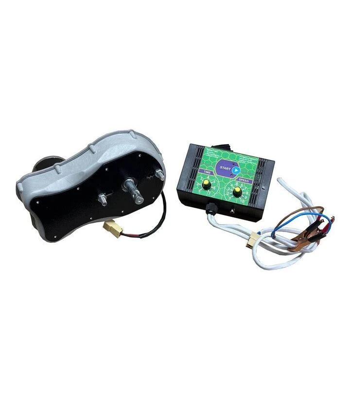 Електродвигун потужністю 100 Вт передає обертання на редуктор медогонки, формуючи необхідний крутний момент. Швидкість обертання регулюється за допомогою блока управління, що дозволяє підлаштовувати роботу під тип рамок і ступінь заповнення. Редуктор знижує навантаження на механічні вузли та забезпечує стабільний режим роботи.