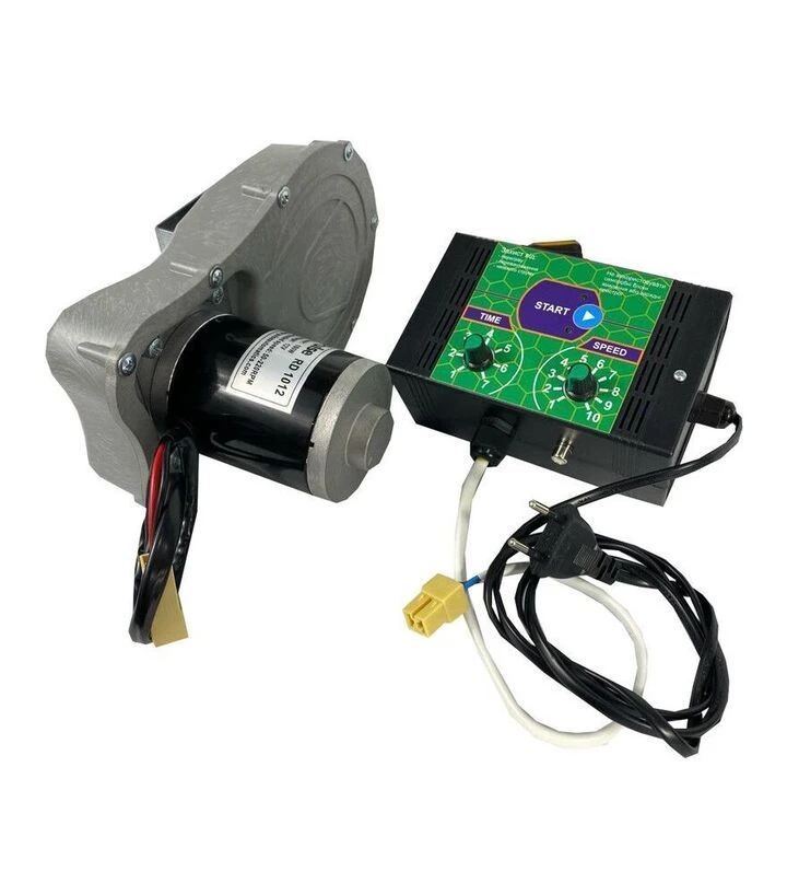 Електродвигун потужністю 100 Вт передає обертання на вал медогонки через ремінну передачу. Така схема забезпечує м’який пуск і стабільну роботу без різких навантажень. Швидкість обертання регулюється блоком управління, що дозволяє підібрати оптимальний режим залежно від типу рамок і ступеня їх заповнення.