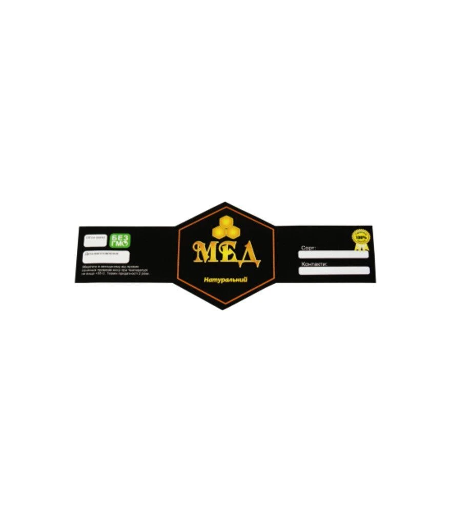 Самоклейна етикетка «Чорний ромб» призначена для маркування тари з медом і нанесення інформації про продукт та контакти пасічника. Формат 4,5×11 см підходить для бокової частини банки або невеликої упаковки, де потрібно акуратно розмістити основні дані: сорт меду, дату фасування, вагу, партію, телефон. Паперова основа дозволяє робити написи вручну та ставити печатки, а клейовий шар забезпечує швидке приклеювання до рівних поверхонь.