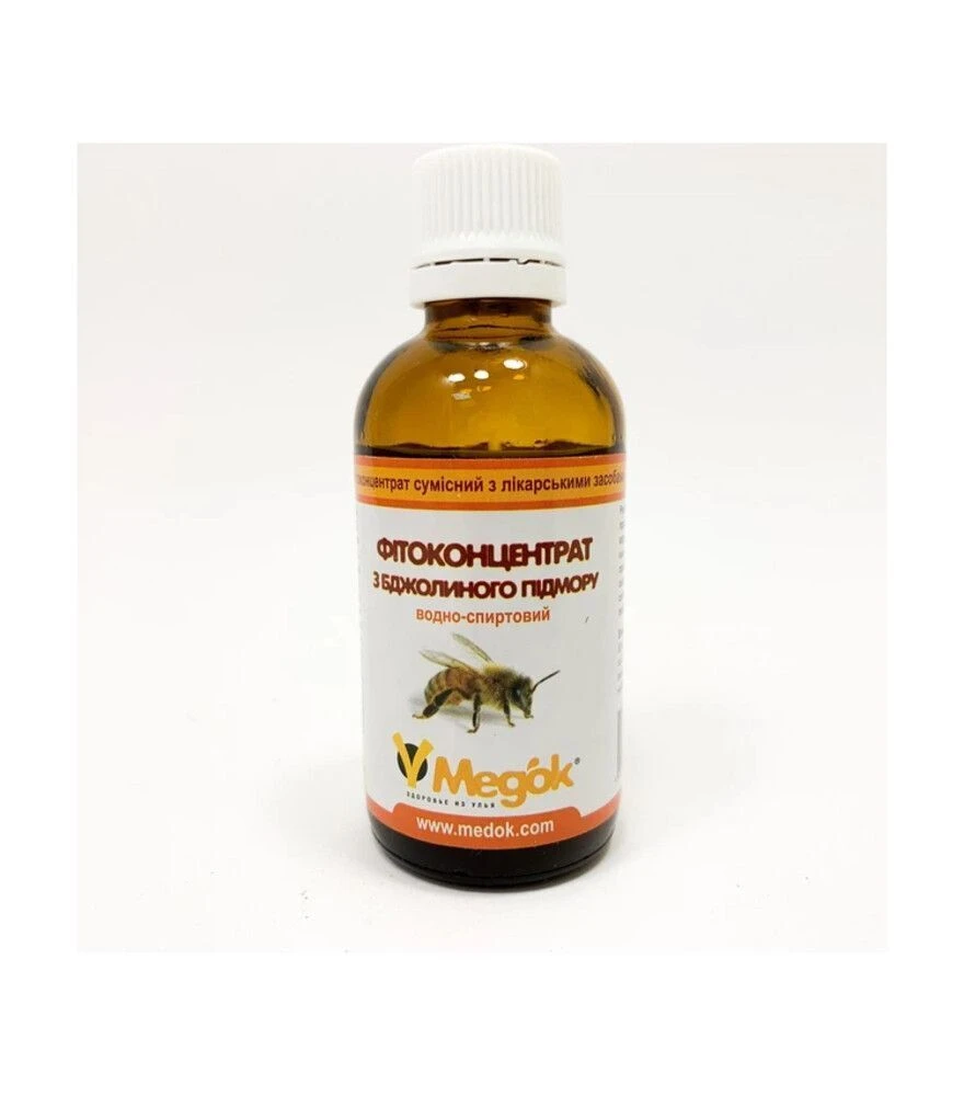Фітоконцентрат з бджолиного підмору - це рідкий продукт бджільництва, отриманий шляхом настоювання підмору. Використовується як харчова добавка в межах раціону з урахуванням рекомендованого дозування. У джерелі зазначено, що при правильному застосуванні побічні ефекти не виявлені, а продукт сумісний із фармакологічними препаратами. Перед використанням важливо враховувати індивідуальну чутливість і наявні протипоказання.