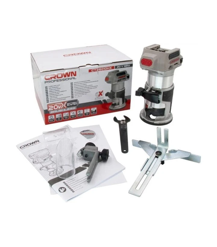 Ця модель поставляється без акумулятора та зарядного пристрою, що дозволяє використовувати існуючі батареї 20 В від платформи CROWN та економити кошти на базовому комплекті. Комплектація включає сам фрезер, ключ для фіксації і розблокування шпинделя, перехідник для підключення пиловидаляючого апарату, направляючу з роликом для точного ведення по краю заготовки та паралельну напрямну для контролю прямолінійних прорізів. Такі аксесуари роблять інструмент готовим до широкого спектру робіт, включно з фрезеруванням кромок, вибіркою пазів, обробкою шипів, зняттям фасок чи декоративним оформленням поверхонь.