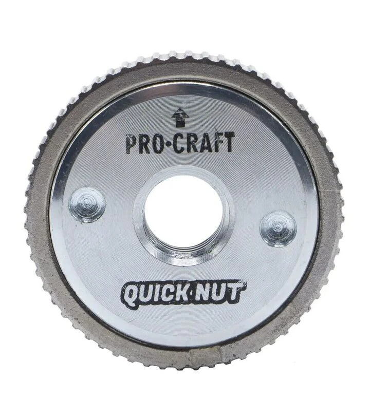 Гайка швидкозатискна ProCraft UniversalProCraft Universal - швидкозатискна гайка для кутових шліфмашин, яка використовується для фіксації відрізних або шліфувальних кругів на шпинделі. Різьба M14 сумісна з більшістю болгарок під диск 115/125/150/180/230 мм (за умови, що інструмент має шпиндель M14). Така гайка спрощує заміну оснастки та дозволяє швидше переходити між різанням і зачисткою.