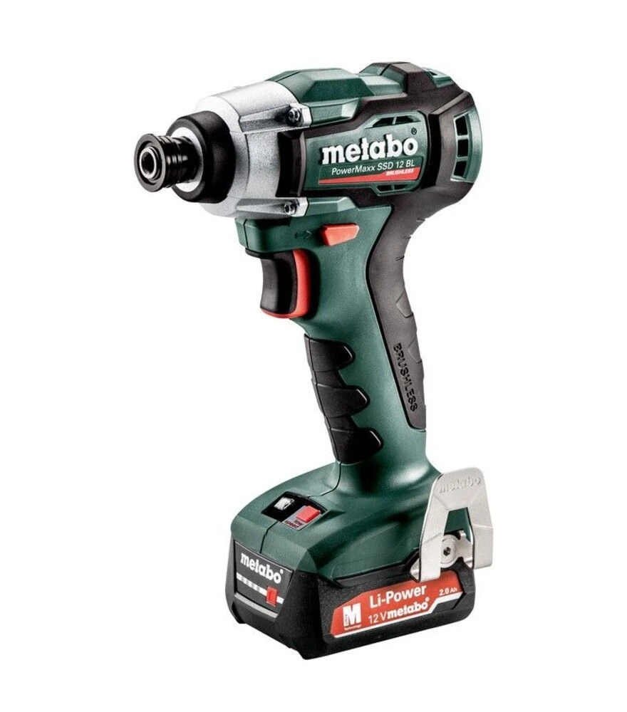 Metabo PowerMaxx SSD 12 BL - компактний ударний гайковерт класу 12 В для монтажних і сервісних робіт. Оснащений безщітковим двигуном, що забезпечує стабільну роботу та ефективне використання заряду акумулятора. Максимальний крутний момент становить 140 Нм, що дозволяє працювати з гвинтами до М14. Частота обертання регулюється в діапазоні 0–2500 об/хв, кількість ударів - до 4000 уд/хв. Внутрішній шестигранний патрон 1/4" (6,35 мм) підходить для стандартних біт. Комплект включає два акумулятори 12 В 2 А·год, зарядний пристрій та кейс metaBOX 118.