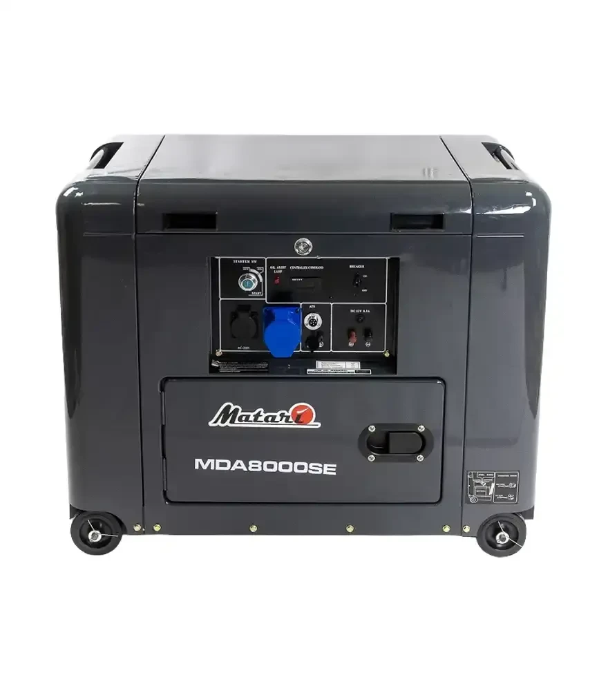 Дизельний генератор Matari MDA8000SE-ATS — потужне рішення для резервного живлення. Його номінальна потужність становить 5,5 кВт, а максимальна — 6 кВт, що робить його ідеальним для використання в домогосподарствах, на виробництвах та в комерційних установах. Генератор оснащений одноциліндровим чотиритактним дизельним двигуном з повітряним охолодженням, який забезпечує стабільну роботу і має витрату палива 1,4 л/год при 60% навантаженні.