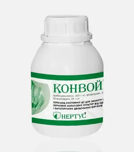 Конвой — системний післясходовий гербіцид для захисту посівів зернових колосових культур від однорічних і багаторічних дводольних бур’янів. Завдяки комбінації трьох діючих речовин (триасульфурон — 95 г/кг, трибенурон-метил — 300 г/кг, флорасулам — 105 г/кг) забезпечує широкий спектр контролю, включно з падалицею «хімічних» соняшників.