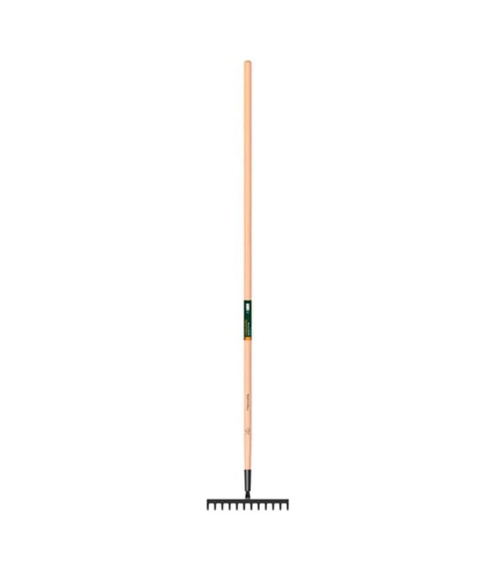 Граблі оснащені робочою частиною зі сталі та дерев’яною ручкою довжиною 1550 мм, що забезпечує комфортне положення під час роботи. Загнуті зубці шириною 300 мм дозволяють легко вирівнювати ґрунт та прибирати дрібне сміття. Натуральна ручка з FSC® деревини міцна, зручна і не ковзає в руках.