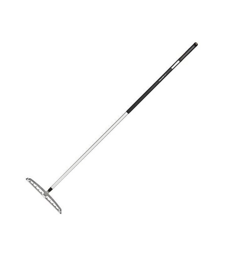 Головка грабель виготовлена зі сталі подвійного гарту, що забезпечує міцність зубців під час роботи з ґрунтом. Ручка виконана з легкого алюмінію, який поєднує невелику вагу та достатню жорсткість конструкції. Загальна довжина інструменту становить 1640 мм, що дозволяє працювати на ділянці без необхідності нахилятися під час вирівнювання ґрунту.