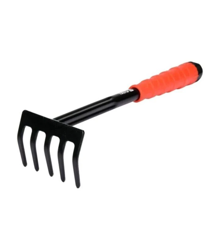 Робоча частина з сталі надійно граблює рослинне або садове сміття, не деформується при контакті з землею чи піском. Гумова ручка забезпечує комфортний хват навіть у рукавицях, а невелика ширина дає змогу працювати біля кущів чи клумб.