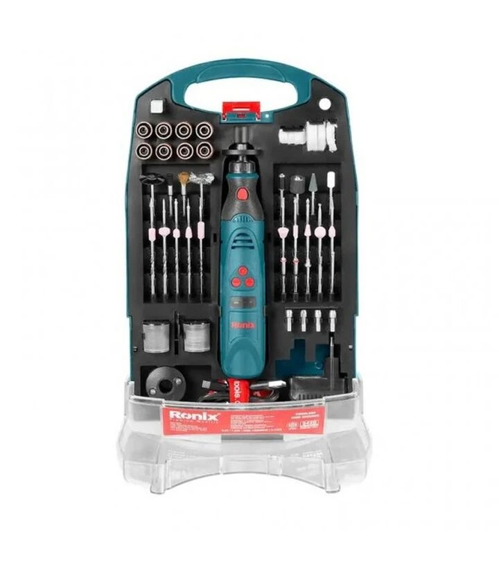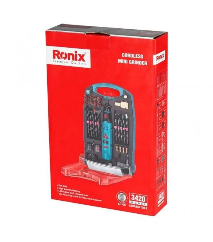 Гравер Ronix 3420 поєднує мобільність акумуляторного живлення та компактні розміри, зручні для точних робіт. Завдяки LED-підсвітці інструмент забезпечує хорошу видимість у темних або вузьких ділянках. П’ять режимів швидкості дають можливість обрати оптимальний темп роботи, а захист від перевантаження підвищує надійність при тривалому використанні. Комплект насадок розширює можливості застосування без додаткових покупок.