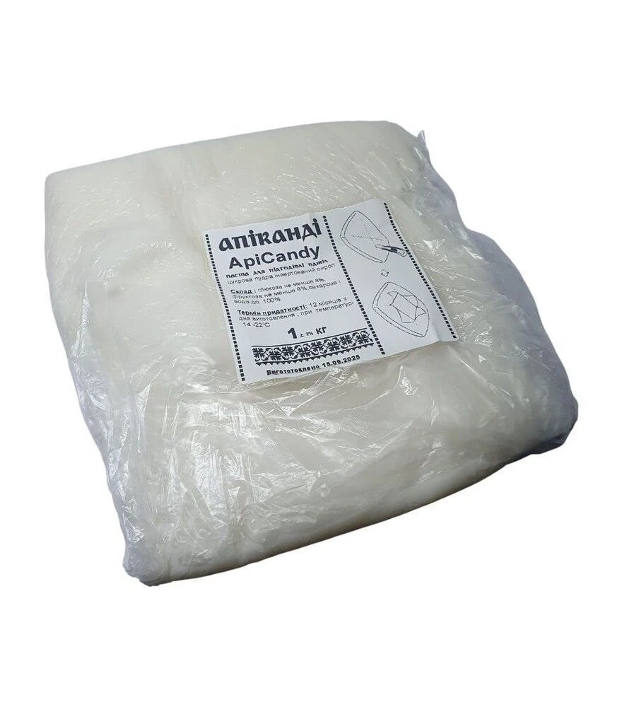 Канді Апіканді - готове підживлення для бджіл у пастоподібній формі на основі сахарози з додаванням інвертованих цукрів і води. Цукор у складі перемелений до мікрокристалів, кожен з яких покритий тонкою плівкою сиропу з глюкози та фруктози. Така структура зменшує утворення центрів кристалізації, тому маса зберігає стабільну консистенцію і зручна для споживання бджолами. Підходить для підтримки сімей у періоди дефіциту кормів, стимуляції розвитку та роботи з новими сім’ями.