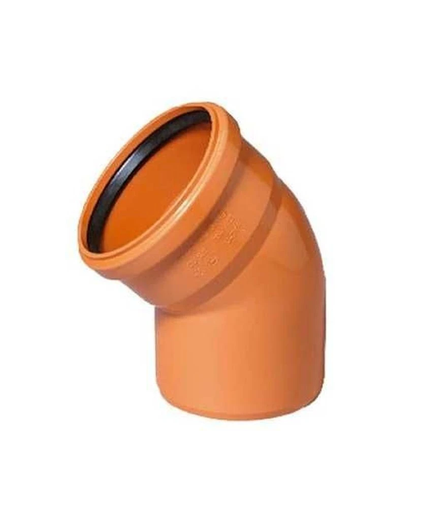 Додаткові характеристики: Поворот під кутом 45 градусів для уникнення засмічень і гідроударів; Матеріал: ПВХ (рудий колір); З'єднання розтрубне, з гумовим ущільнювальним кільцем; Хімічно та кислотно стійке; Робоча температура: до 45 °С (короткочасно до 60 °С); Робочий тиск: до 0,05 МПа; Для зовнішніх мереж безнапірної каналізації, зливових стоків та внутрішньоквартальної каналізації