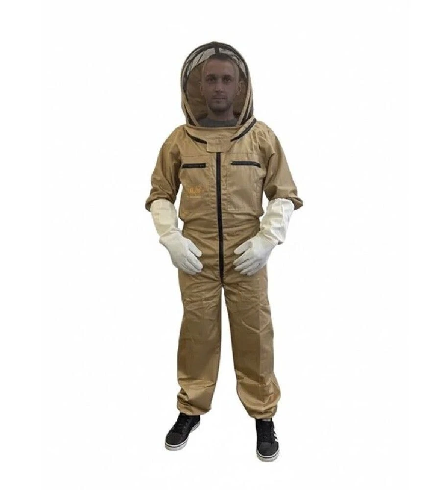 Комбінезон бджоляра призначений для захисту під час роботи на пасіці та зниження ризику укусів бджіл. Комплект використовується під час оглядів вуликів, формування гнізда, підгодівлі та інших щоденних робіт. Комбінезон виготовлений з бавовняної тканини, яка добре пропускає повітря та підходить для тривалої роботи. Євро-маска з металевою сіткою забезпечує захист обличчя і водночас не обмежує огляд. Шкіряні рукавички з нарукавниками захищають руки та передпліччя.
