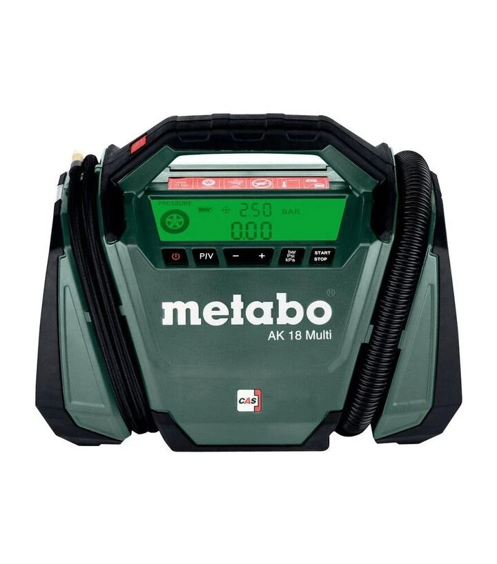 Metabo AK 18 Multi - багатофункціональний акумуляторний компресор для універсального використання: накачування автомобільних і велосипедних шин, м’ячів, надувних матраців, басейнів та інших виробів. Працює від акумуляторного блока 18 В або альтернативно від автомобільної мережі 12 В через комплектний кабель. Максимальний тиск становить 11 бар, продуктивність подачі - до 16 л/хв.