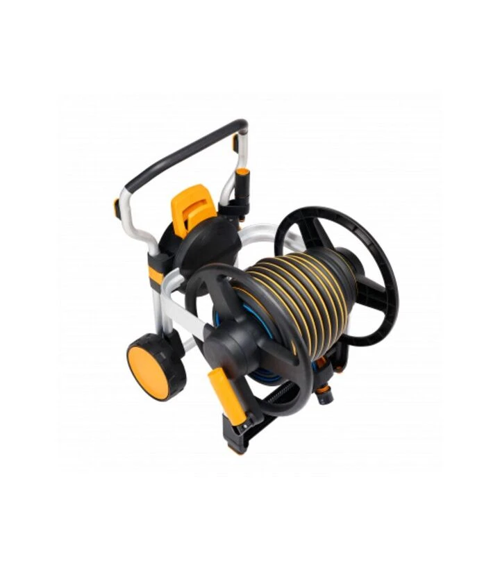 Встановіть котушку на рівну поверхню, розкрутіть шланг та під’єднайте його до джерела води. Під час поливу корпус обертається на 360°, не заважаючи руху. Після завершення роботи плавно намотайте шланг за допомогою ручки - осцилятор рівномірно укладе його на барабан. Для транспортування використовуйте телескопічну ручку та колеса.