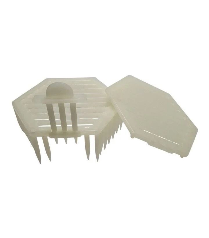 Ковпачок для бджолиної матки «Шестигранник» призначений для тимчасової ізоляції матки та її захисту під час підсадки в бджолину сім’ю. Він використовується безпосередньо на соті та дозволяє обмежити рух матки в межах заданої зони, не вилучаючи її з гнізда. Конструкція ковпачка забезпечує контакт бджіл із маткою та створює умови для спокійної адаптації сім’ї під час робіт на пасіці.