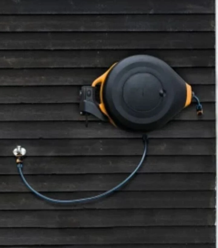 Кронштейн фіксується на вертикальній поверхні за допомогою стандартного монтажу. Після встановлення котушка легко навішується на опорну частину та утримується завдяки металевій основі. Доступ до шланга залишається зручним, а котушка не займає простір на землі.