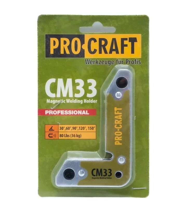 Кутник магнітний для зварювання ProCraft CM33 (900033) Магнітний кутник ProCraft CM33 - це надійний інструмент для зручного і точного фіксування металевих деталей під необхідними кутами під час зварювальних робіт. З силою зчеплення 36 кг цей кутник забезпечує стабільність і точність монтажу конструкцій під різними кутами. Завдяки різним варіантам кута (від 30° до 150°) цей інструмент підходить для роботи з різними типами зварювальних з'єднань.