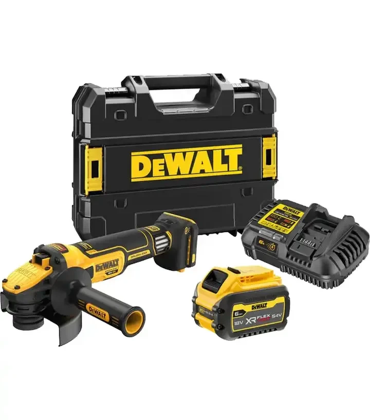Шліфмашина кутова (болгарка) акумуляторна безщіткова DeWALT DCG409VST1 Потужна бездротова болгарка з регульованим обертанням і технологією FLEXVOLT ADVANTAGE для підвищення ефективності при підключенні акумулятора XR FLEXVOLT. Працює на акумуляторі 18 В (6 Аг), здатна обертати диск 125 мм до 9000 об/хв. Містить функції плавного пуску, електронного гальма та муфти, інтелектуальний захист двигуна від пилу та зручну рукоятку -усе для професійного, безпечного та комфортного використання.
