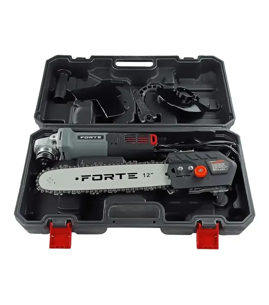 Кутова шліфмашина Forte AGCS1001 2 в 1 1000Вт, 125мм, 12" Forte AGCS1001 - це універсальний інструмент "2 в 1", який поєднує функції кутової шліфмашини (болгарки) та міні-ланцюгової пилки. Потужність 1000 Вт дозволяє ефективно різати, шліфувати та пиляти. У комплекті є все необхідне для обох режимів: захисні кожухи, ланцюг, шина, корпус пилки, допоміжна ручка та кейс. Діаметр круга - 125 мм, а довжина шини - 12 дюймів. Працює від звичайної мережі. Forte - виробник, відомий своєю надійною та доступною технікою для дому, ремонту й господарських робіт. Його інструменти прості в роботі й добре витримують щоденне навантаження.