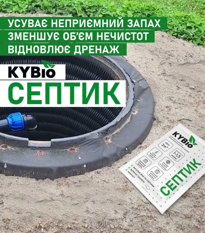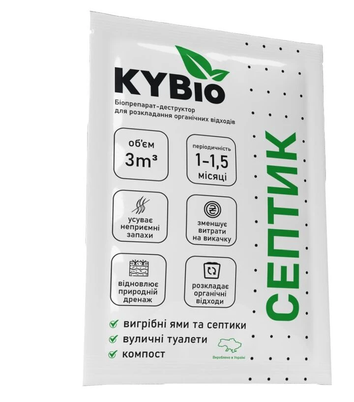 KYBIO Септик допомагає утримувати санітарні споруди в належному стані, скорочує витрати на обслуговування та знижує неприємні запахи. Безпечний для навколишнього середовища, не містить хімікатів.